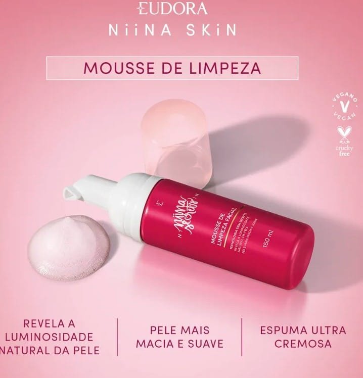 Pensando em cuidar da sua pele em todos os momentos da sua vida, Eudora e Niina Secrets Skin trazem o Mousse de Limpeza Facial mais instagramável de todos, uma espuma rosa para limpar a pele sem ressecar.